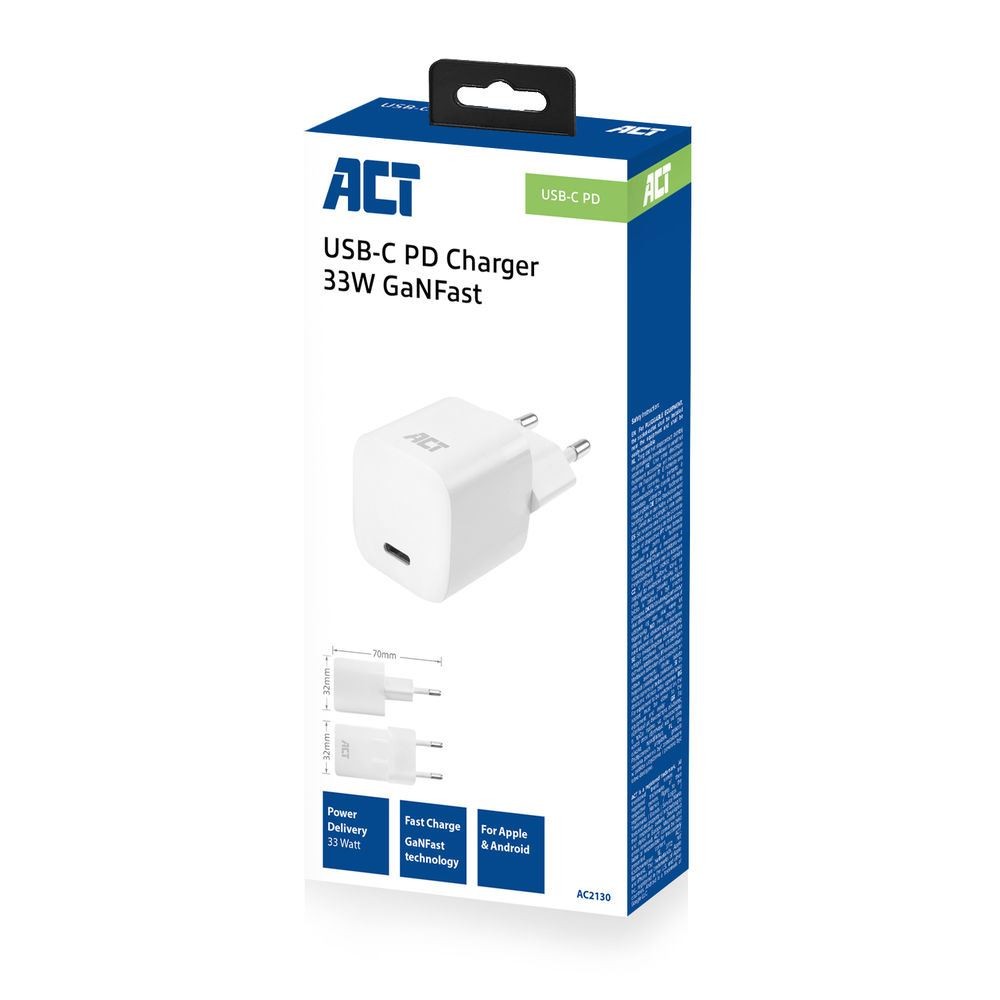 De 33W USB-C Lader laadt jouw Apple en Android smartphone of tablet snel op: 70% opgeladen in maar 30 minuten. De AC2130 is uitgerust met Power Delivery. Deze krachtige maar compacte USB-C-lader is gemakkelijk mee te nemen. De USB-C-lader stopt automatisch met laden wanneer de batterij opgeladen is.De AC2130 USB-C Lader is uitgerust met de GaNFast technologie. Dit betekent dat Gallium Nitride is gebruikt als semiconductor. Hierdoor kan er een hoge maar efficiënte stroom door een compacte lader met minimale warmteafgifte.De AC2130 USB-C Lader is een 33W-lader is ontworpen voor het opladen van de laatste iPhones. Sluit jouw iPhone aan op de ACT 33W USB-C Fast Charger en de smartphone wordt tot 70% opgeladen in maar 30 minuten.Gebruik de compacte AC2130 lader voor het laden van een Android smartphone/tablet met Power Delivery-ondersteuning. De USB-lader bepaalt samen met de smartphone/tablet het juiste laadprofiel.