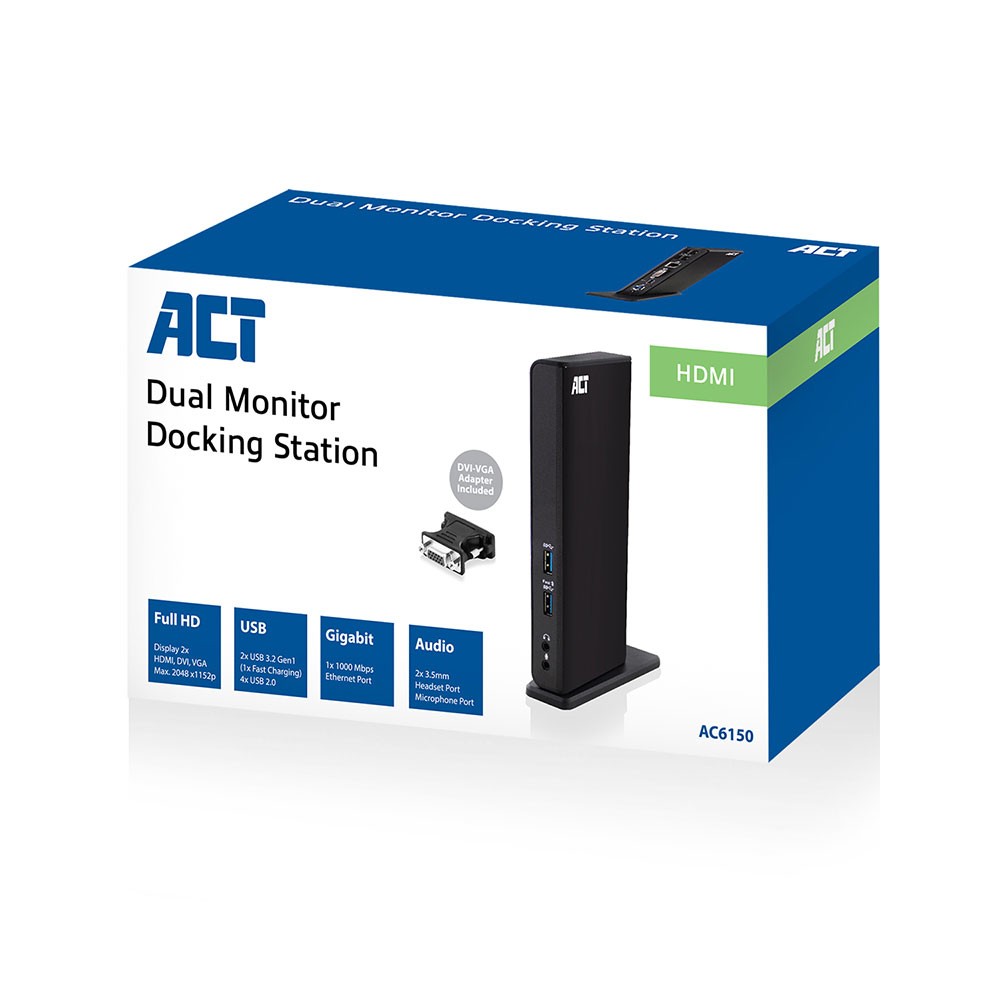 ACT AC6150 USB Dual Docking station, met HDMI, DVI, 2x USB 3.2 Gen 1 (USB 3.0) , 4x USB 2.0, Ethernet en 2x 3.5mm. Connectiviteitstechnologie: Bedraad, Hostinterface: USB 3.2 Gen 1 (3.1 Gen 1) Type-A, Type aansluitplug: 3,5 mm. Ethernet LAN, data-overdrachtsnelheden: 10,100,1000 Mbit/s. Kleur van het product: Zwart, HD type: Full HD, Resolutie (maximum digitaal): 2048 x 1152 Pixels. Type stroombron: DC. Breedte: 215 mm, Diepte: 130 mm, Hoogte: 117 mm