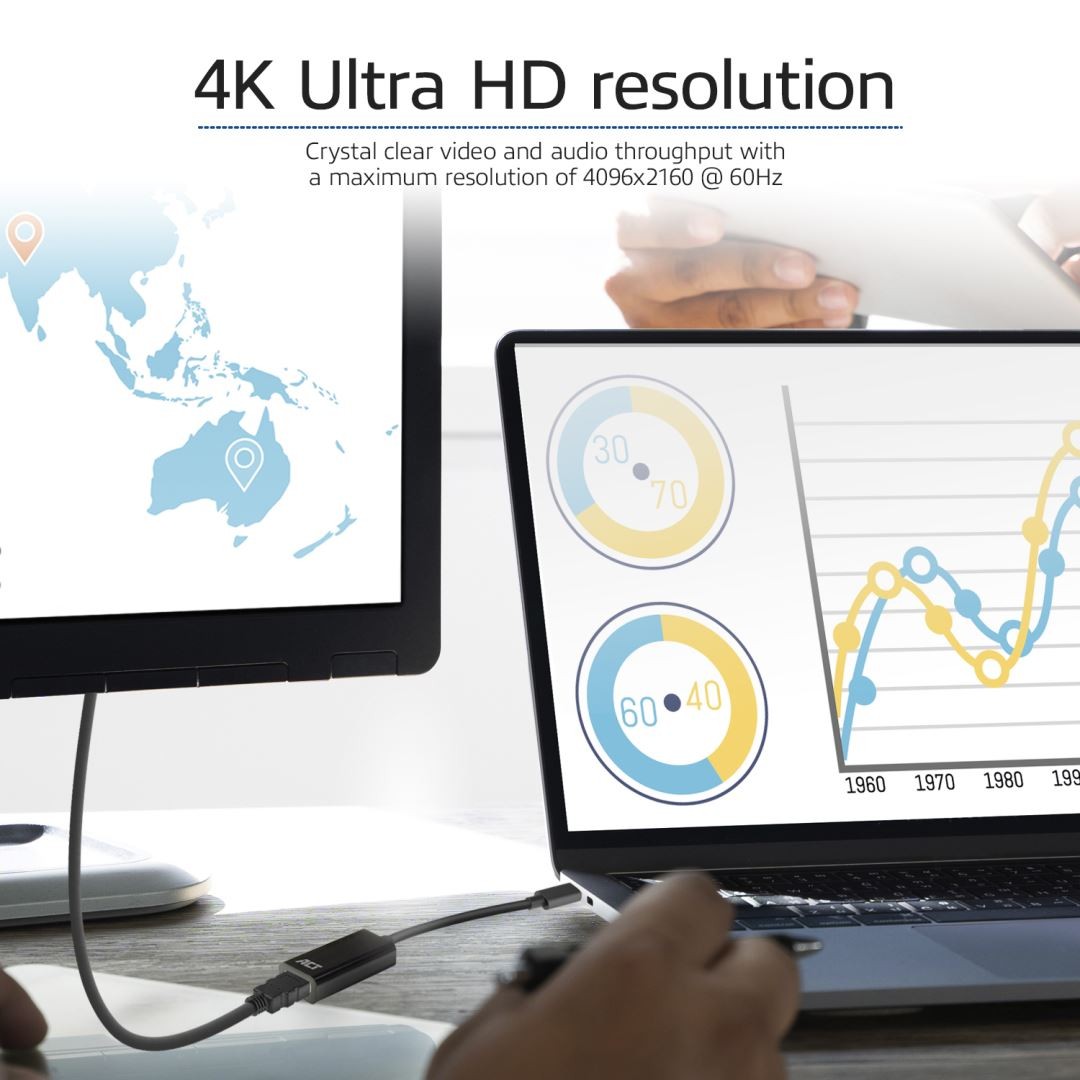 Met de AC7305 USB-C naar HDMI Adapter sluit je jouw notebook met USB-C aan op een beeldscherm of beamer met HDMI-ingang. De maximale ondersteunde resolutie is 4096 x 2160 (4K) @ 30Hz. Deze resolutie is ideaal voor het tonen van video's, afbeeldingen, presentaties etc. Let er wel op dat je notebook een USB-C poort met DP Alt Mode ondersteuning heeft.
