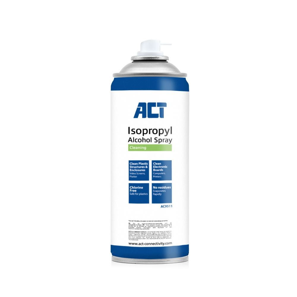 De ACT AC9511 Isopropyl Alcohol spray is ideaal voor het schoonmaken van printplaten en plastic onderdelen van computers en printers. De spray is chloorvrij, laat geen resten achter en verdampt snel. Daarnaast is de Isopropyl Alcohol spray 100% ozonvriendelijk