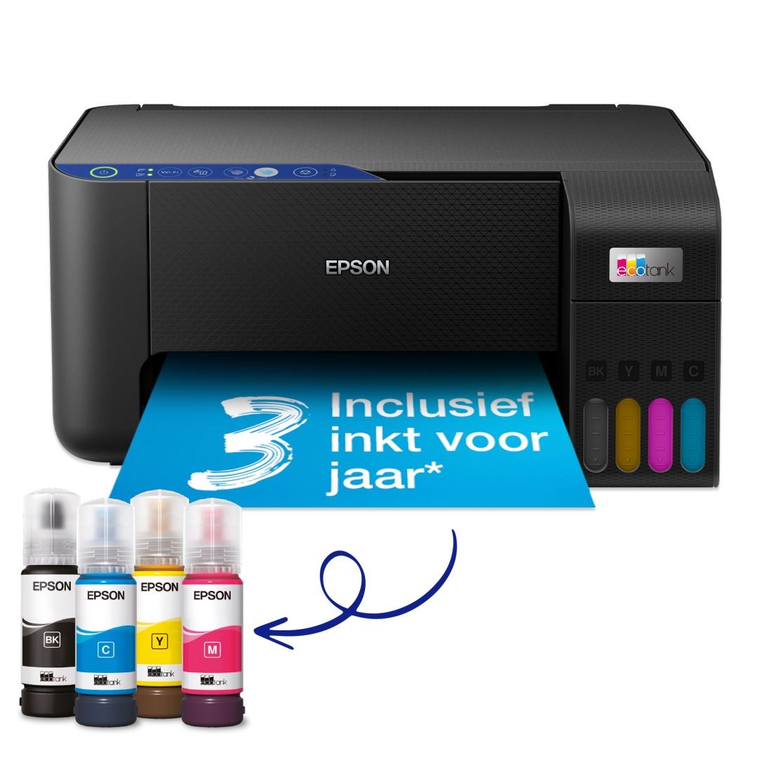 Bespaar tot 90% op de inktkosten* met een EcoTank-printer met inkttankDeze A4-inkjetprinter met navulbare inkttanks is perfect voor iedereen die goedkoop wil printen. In de meegeleverde set inktflessen, zit net zoveel inkt als in maximaal 72 cartridges* Extra voordelen zijn mobiel printen, Wi-Fi, kopiëren en scannen.- Verlaag uw kosten met 90%1- Zeer voordelig printen- Printen, kopiëren en scannenBespaar tot wel 90% op uw printkosten* met Epson EcoTank-printers zonder cartridges. Dankzij de speciaal ontworpen inktflessen met hoog rendement kunnen de geïntegreerde inkttanks eenvoudig worden gevuld. Zonder cartridges en met de flexibele connectiviteitsfuncties is dit de perfecte printer voor iedereen die tegen ongelofelijk lage kosten per pagina in hoge kwaliteit wil printen.Cartridges behoren tot het verledenMet EcoTank kunt u probleemloos thuis printen. U kunt de inkttanks met hoge capaciteit gemakkelijk en snel bijvullen. De flessen hebben een sleutelvergrendeling waardoor ze alleen op de juiste kleur kunnen worden gebruikt. Op het inktniveauscherm aan de voorzijde kunt u eenvoudig zien wanneer de tank moet worden bijgevuld.Blijf besparenMet deze voordelige printer bespaart u tot wel 90% op uw printkosten.* Hij wordt geleverd met inkt voor maximaal 3 jaar.* Met één set inktflessen kunnen tot wel 4500 pagina’s in zwart-wit en 7500 pagina’s in kleur worden afgedrukt*. Dat is hetzelfde als maximaal 72 cartridges!*Epson Smart Panel-appMet deze app kunt u uw printer bedienen vanaf uw smart device.*. U kunt er documenten en foto’s mee printen, kopiëren en scannen, de printer ermee instellen en beheren en er problemen met de printer mee oplossen, allemaal vanaf uw telefoon of tablet.Boordevol functiesMet een papierlade voor 100 pagina’s aan de achterkant, de mogelijkheid om foto’s randloos te printen (tot 10 x 15 cm) en een printsnelheid tot wel 10 pagina’s per minuut* kunt u met gemak een groot aantal taken uitvoeren in korte tijd.Moderne flexibiliteitDankzij het compacte design en volledige Wi-Fi- en Wi-Fi Direct-connectiviteit kunt u deze printer eenvoudig in uw huidige thuissituatie integreren en vanaf mobiele telefoons, tablets en laptops printen*.Heat-Free TechnologyMet de warmtevrije Micro Piezo-technologie kunt u profiteren van een lager energieverbruik en zijn minder vervangende onderdelen nodig. De printkop is vooraf geïnstalleerd, dus u kunt uw printer probleemloos instellen.*Zie epson.nl/ecotankfootnotes